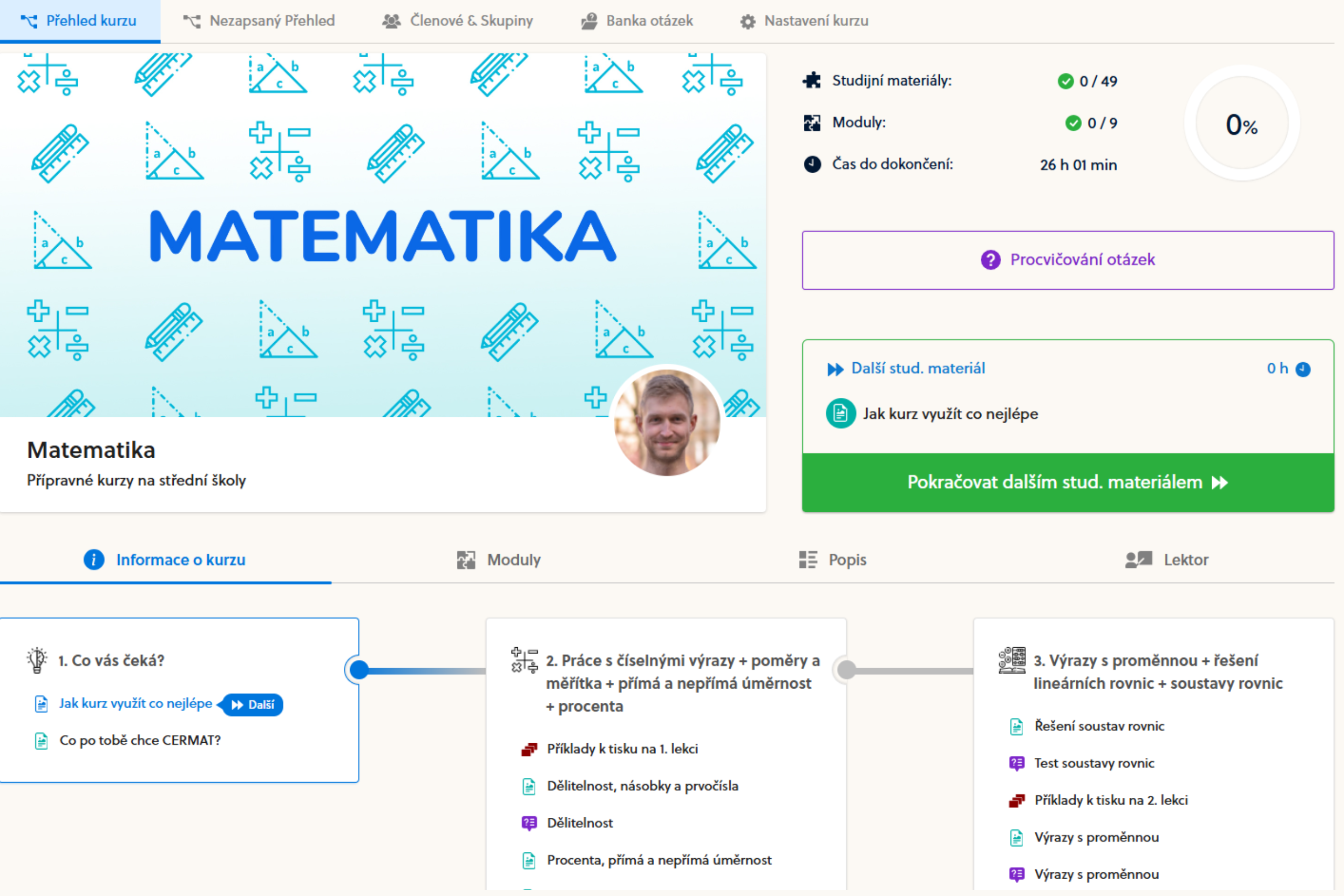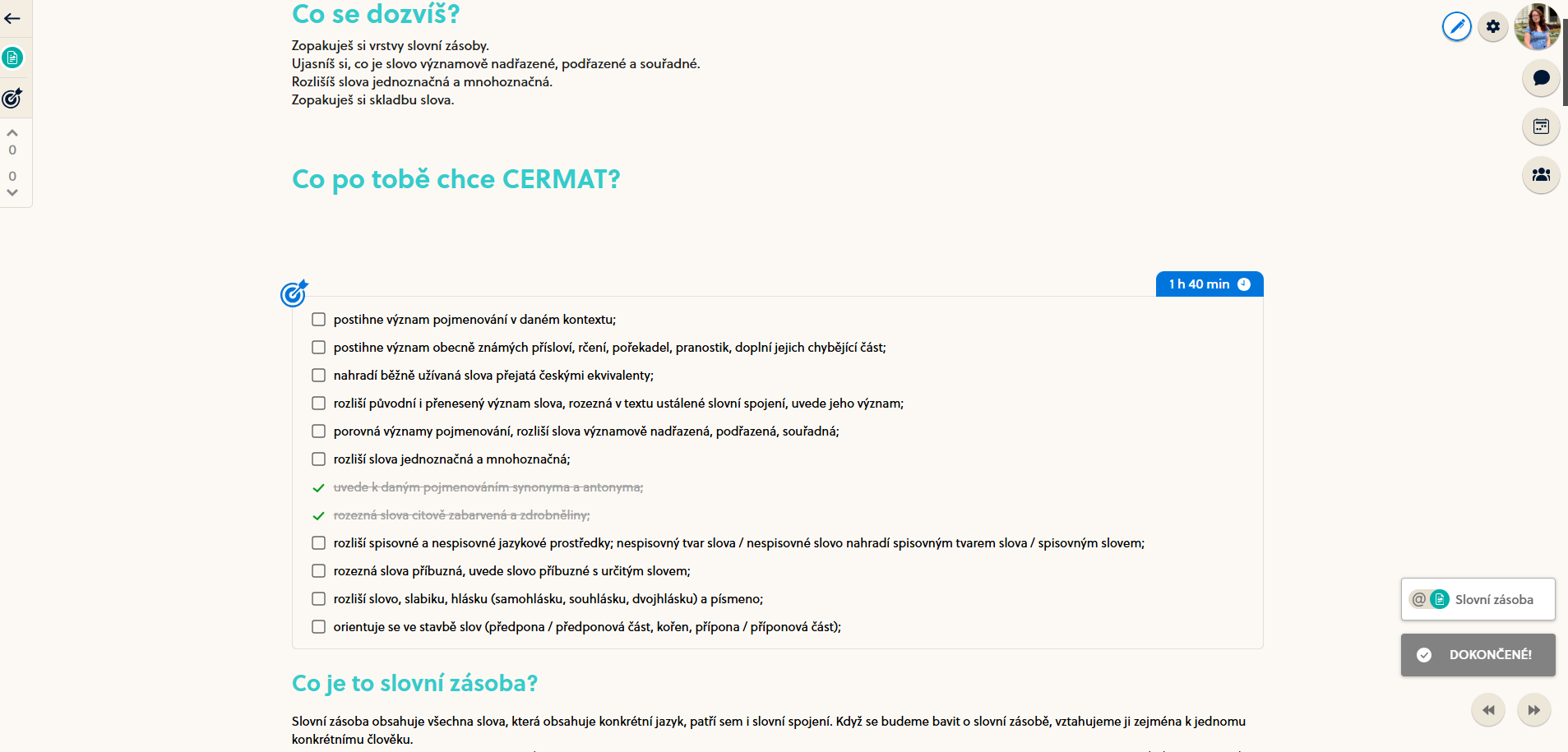 Pokud zakoupíte pouze přípravu na CERMAT testy z českého jazyka, získáte přístup do kurzu českého jazyka, ve kterém je zahrnutý interaktivní e-learning, webináře k učivu z českého jazyka a obecné webináře k CERMAT testům.